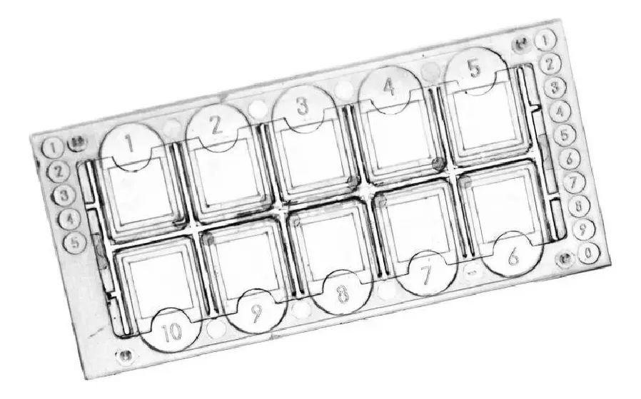 Cada poço possui 18 círculos facilmente visíveis no microscópio com 100x de engrandecimento.