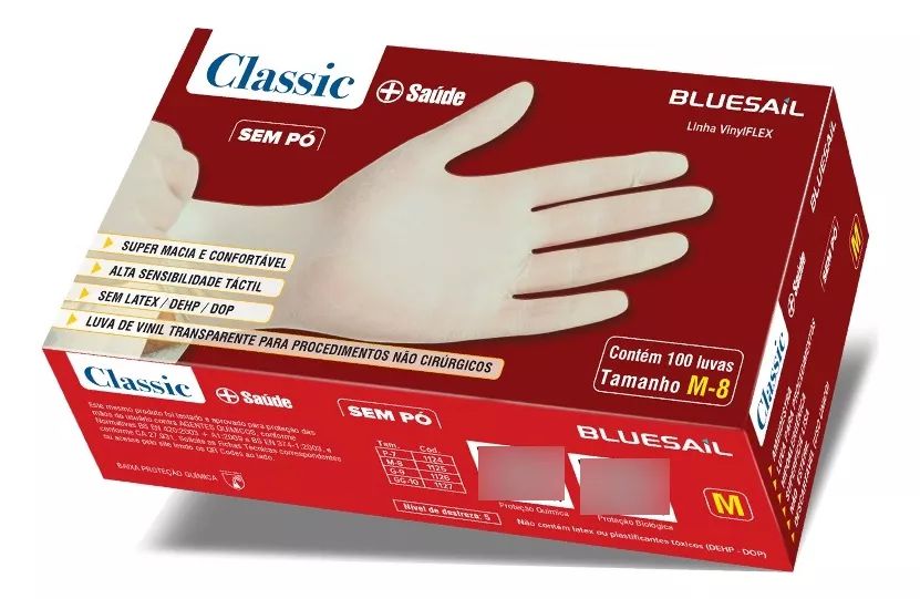 A luva de vinil da Bluesail é desenvolvida para a área de saúde, a luva Classic + Saúde é transparente e não contém pó. Combinada com elastômeros flexibilizadores, a luva Classic +Saúde apresenta maior elasticidade e maciez, facilitando a introdução das mãos, e dando maior conforto, resistência e impermeabilidade - não deixando passar - fluídos ou líquidos internos (suor) ou externos (umidade, sangue ou outros agentes). Acabamento interno PU Coated impermeabiliza e facilita introdução das mãos.